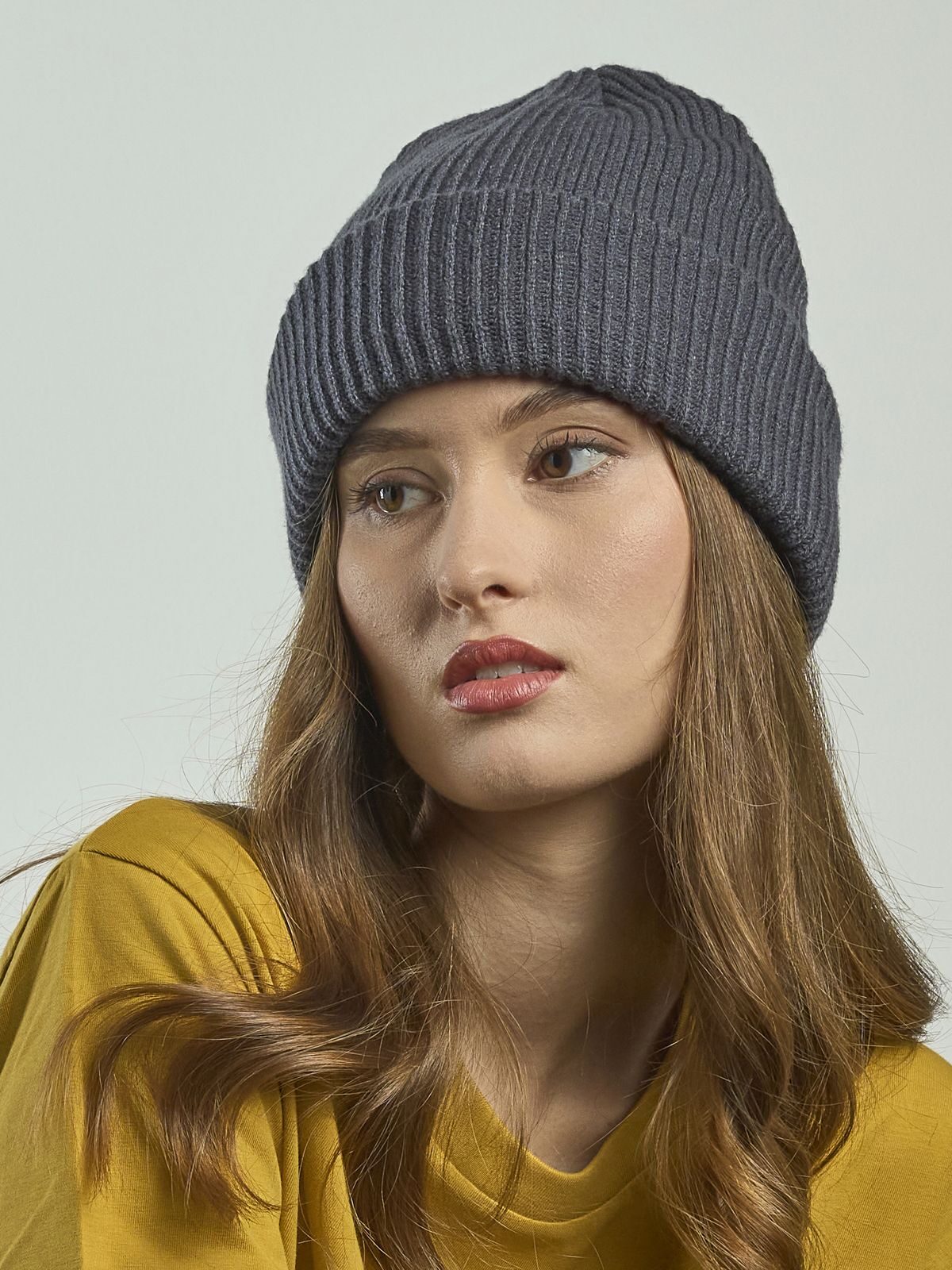 Cuffia a coste con risvolto. in poliestere riciclato e fodera in Polartec. Etichetta removibile.
