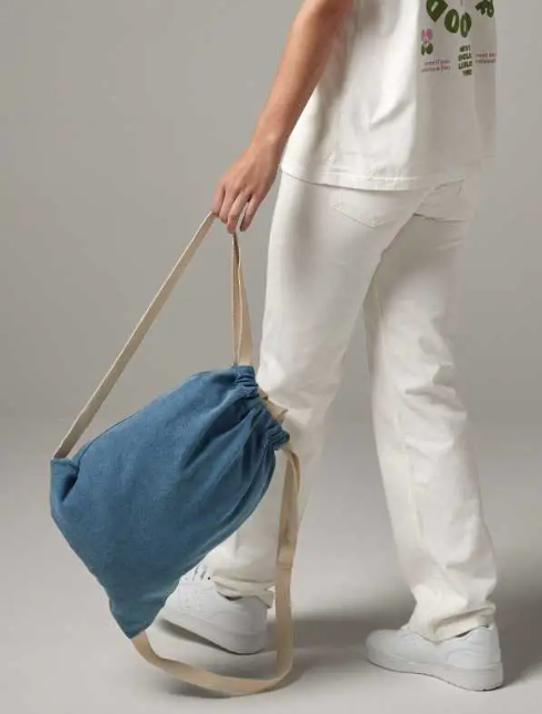 Sacca con doppio manico, trasportabile a mano o come zaino, chiusura con coulisse, spallacci in cotone. Dimensioni: 46x37 cm, capacità: 12 litri. 100% miscela cotone e poliestere denim.