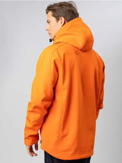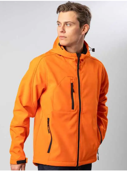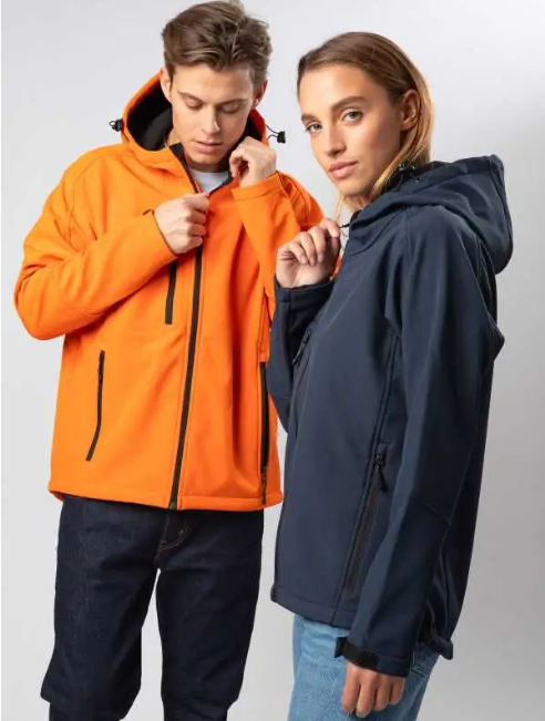 94% poliestere, 6% elastan. Giacca in softshell a 3 strati, cappuccio con fermi in plastica, occhielli e cordino neri. Due tasche laterali con zip, una taschino sul petto con zip, tirazip in plastica, zip interna lato cuore per la personalizzazione, polsini regolabili con velcro, interno in micropile. Bordo inferiore con cordino regolabile con fermi.Impermeabilità 8000 mm, traspirabilità 1000 gr/m2. Etichetta strappabile.