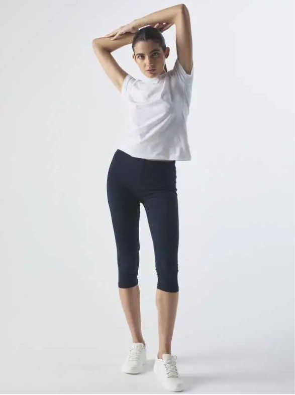 92% cotone, 8% elastane. Leggings al polpaccio da donna single jersey, vita elasticizzata, vestibilità slim, cuciture a doppio ago, esterno gamba senza cuciture. Etichetta strappabile. Pantalon