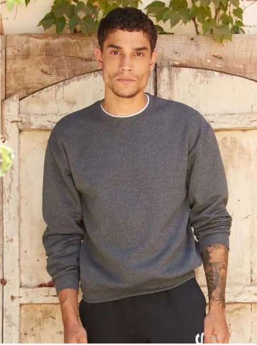 50% cotone 50% poliestere nublend. Felpa girocollo con maniche set-in in tessuto NuBlend resistente ai pelucchi, realizzata con cotone di origine sostenibile coltivato negli Stati Uniti, alta densità di punti per una tela di stampa liscia, polsini e cintura a costine con spandex per maggior elasticità, cuciture a due aghi su collo, giromanica e cintura. Etichetta removibile.