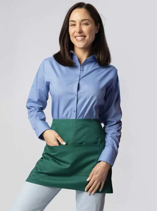 65% poliestere, 35% cotone. Grembiule stile bar con comoda tasca centrale e lunga cintura. Lavabile a 40°C. (Col. WH, NA: 100% cot.)