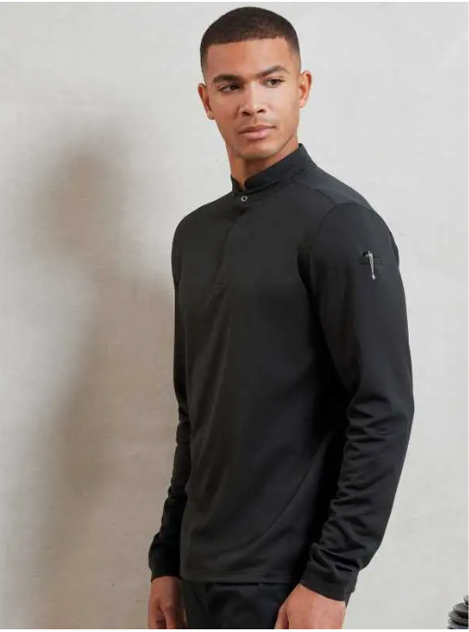 Maglia da chef a manica lunga, colletto alla coreana con bottoni automatici, pattina coperta con bottoni automatici. Taschino porta penna sulla manica sinistra, pannello in rete Coolchecker sul retro per offrire traspirabilità, orlo con spacchetti laterali. Polsini a costine. 100% poliestere riciclato.
